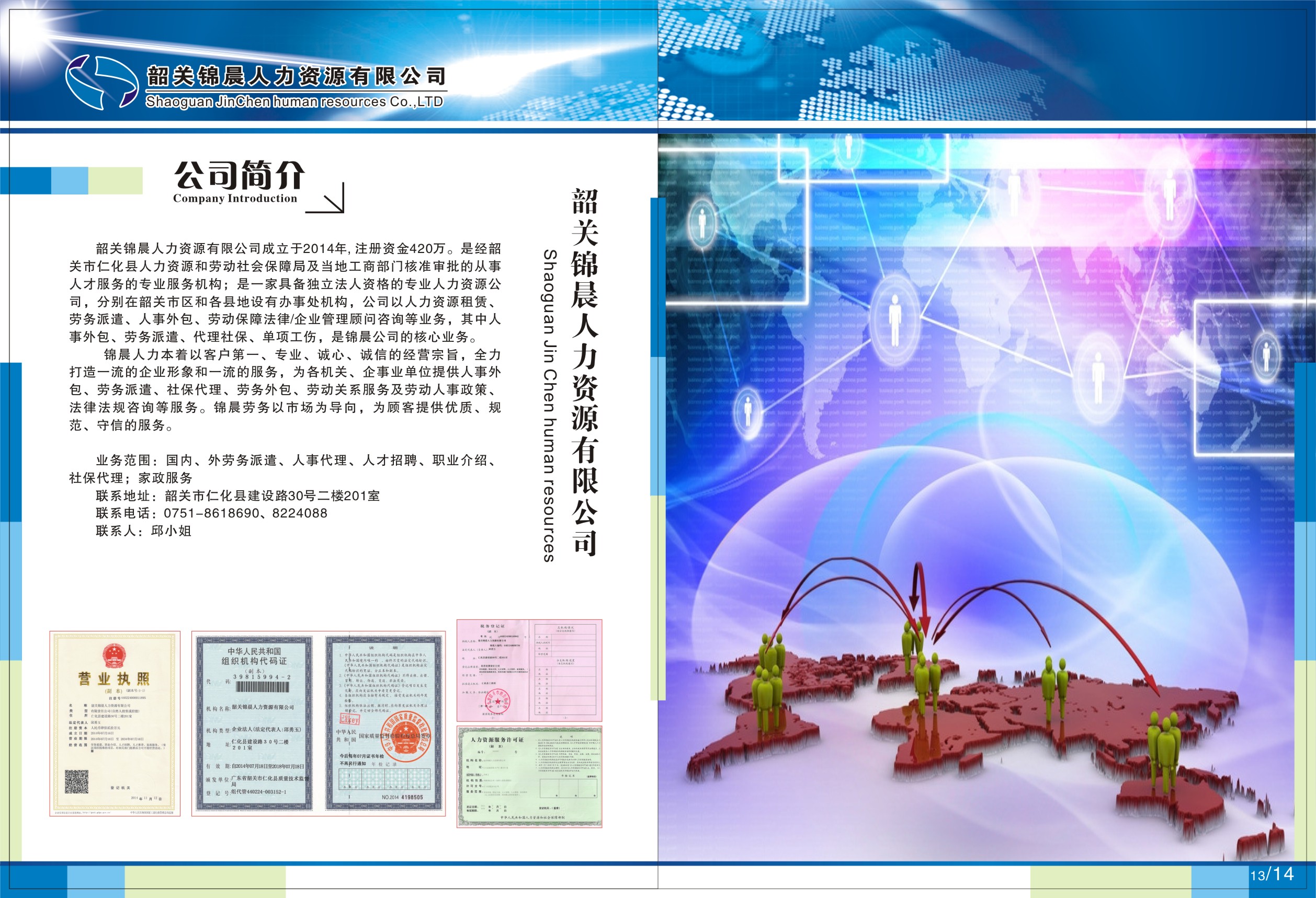 韶關錦晨人力資源有限公司成立于2014年, 注冊資金420萬。是經韶關市仁化縣人力資源和勞動社會保障局及當地工商部門核準審批的從事人才服務的專業服務機構;是一家具備獨立法人資格的專業人力資源公司,分別在韶關市區和各縣地設有辦事處機構,公司以人力資源租賃、勞務派遣、人事外包、勞動保障法律/企業管理顧問咨詢等業務,其中人事外包、勞務派遣、代理社保、單項工傷,是錦晨公司的核心業務。